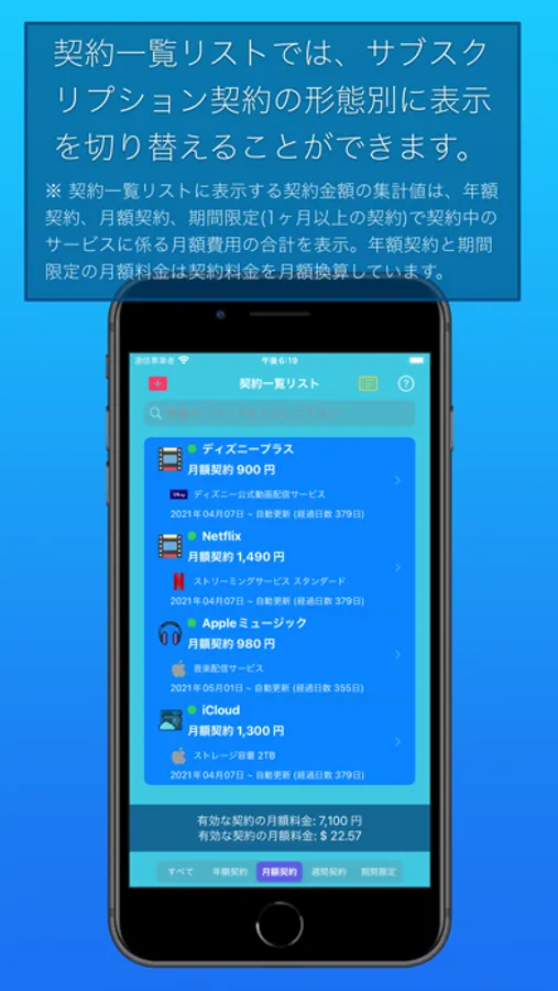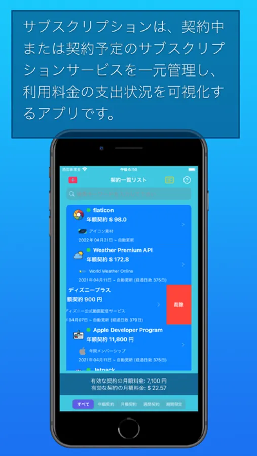 サブスクリプションは、契約中または契約予定のサブスクリプションサービスを一元管理し、利用料金の支出状況を可視化するアプリです。