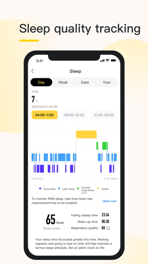[Record Sleep]: Record your sleep data, including sleep duration, deep sleep, light sleep and rapid eye movements (REM), in order to monitor and improve your sleep quality;