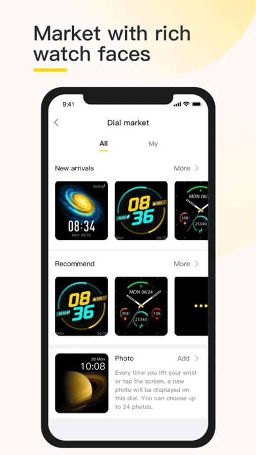 [Change Dial]: A rich selection of watch face themes are available in the brand-new cloud dial market, giving your device a new look every day;