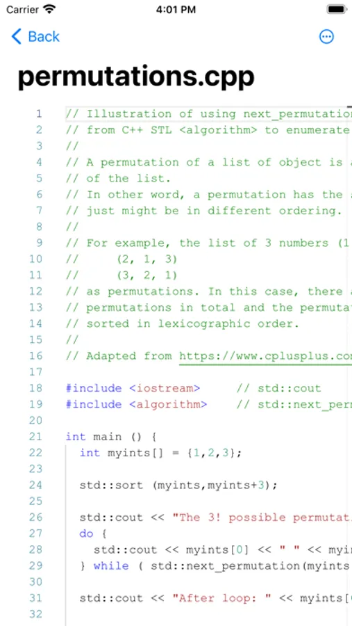 L* C++ is an C++ integrated development environment iOS app. In other words, it allows you to write C++ programs, gets them executed (technically, interpreted) and see the output.