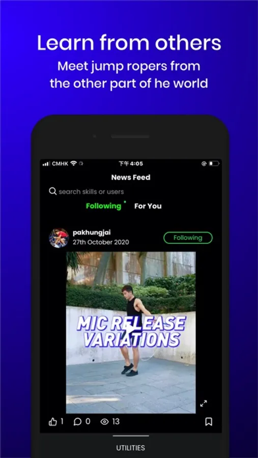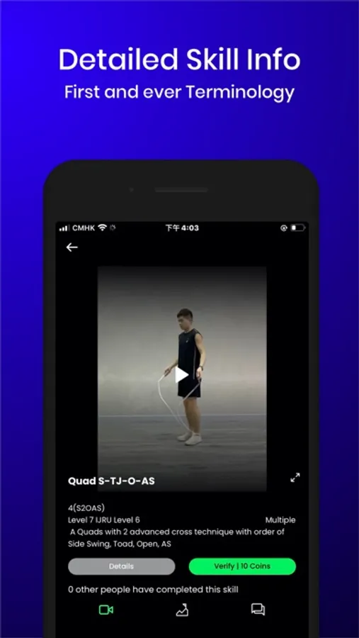 Learn, train and verify your jumping skills. Earn points by verifying your jump rope skills and share that with your fellow jumpers.
