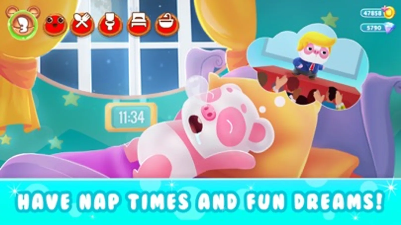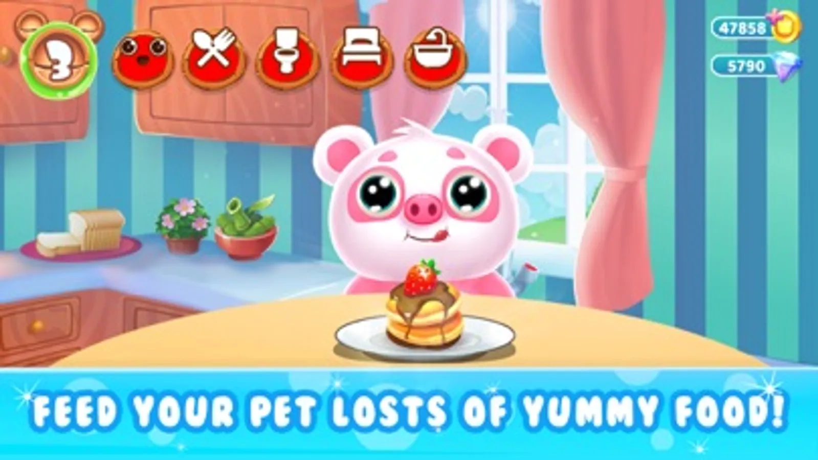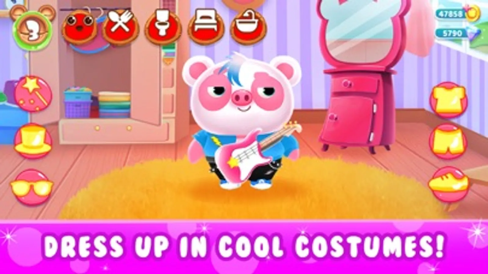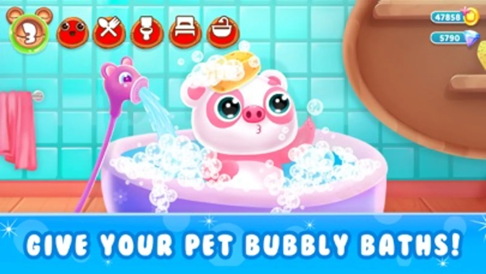 Oh no! The virtual pet is dirty after all the outdoor activities, let’s take him for a nice bubble bath and once he is done with the bath, select super cute clothes for him. It is time to become the piggy panda virtual pet’s fashion stylist and give him beauty makeovers along with cute dress ups in your tamagotchi care simulator game.