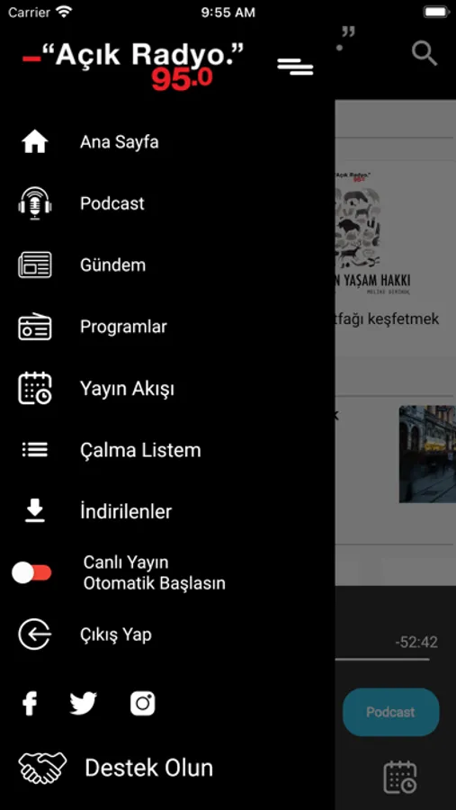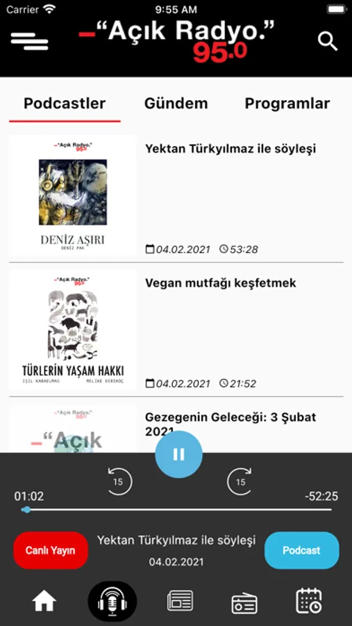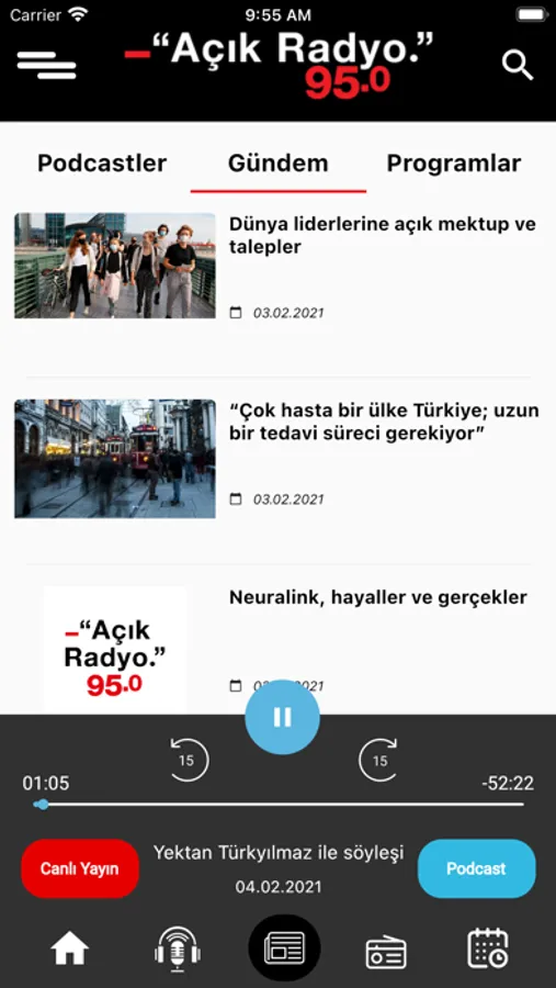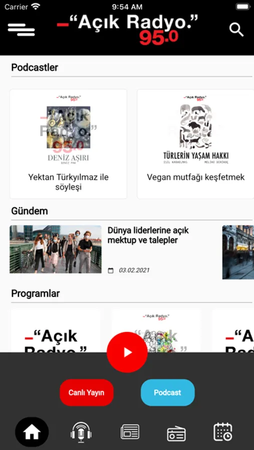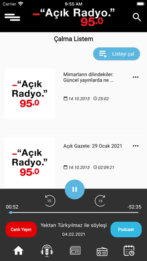 Açık Radyo uygulamasıyla canlı yayınları dinleyebilir, program bilgilerine ulaşabilir ve kayıt arşivimizden podcastlerimize erişebilirsiniz.