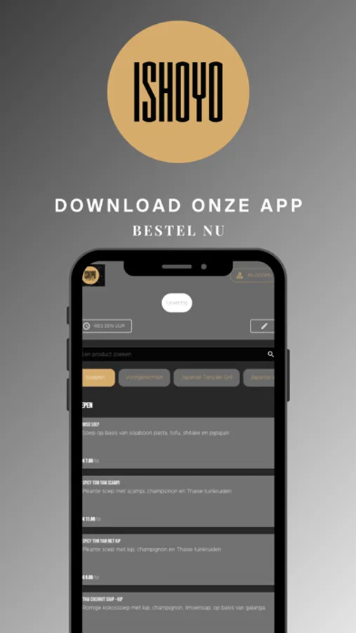 Waar u ook bent, met de app van Ishoyo by Shokudo kan u zonder zorgen bestellen uit het uitgebreide assortiment.