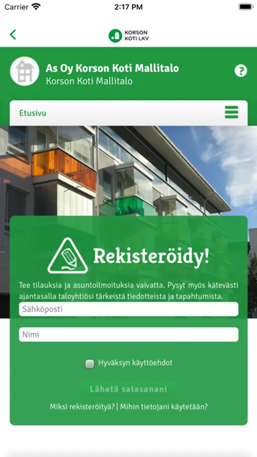 Tällä sähköisellä asiointikanavalla luomme sinulle mahdollisuuden saada informaatiota sekä hoitaa asumiseen liittyvät asiasi sinulle sopivana ajankohtana - paikasta riippumatta. Pääset tekemään ilmoituksia ja tilauksia isännöitsijätoimistollesi sinulle sopivimpana ajankohtana. Tuomme tätä kautta lisäksi mahdollisuuden saada informaatiota asumisympäristöstäsi ja pääset lisäksi yhdellä kirjautumisella kaikkien taloyhtiösi yhteistyökumppaneiden tarjoamiin tietoihin keskitetysti.
