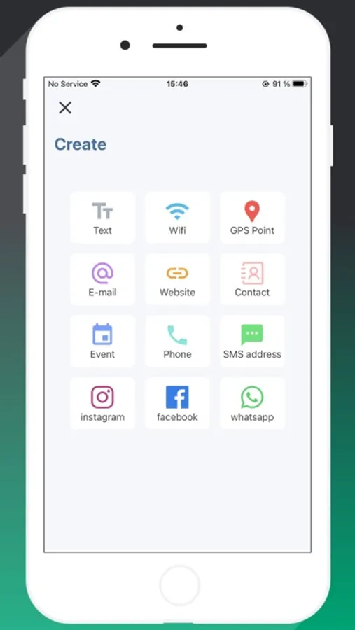 Create Instagram; Facebook; Whatsapp; SMS / MMS address; phone; event; contact; website, url, link to YouTube videos; email address with cc bcc subject and message; GPS point; Wifi and text.