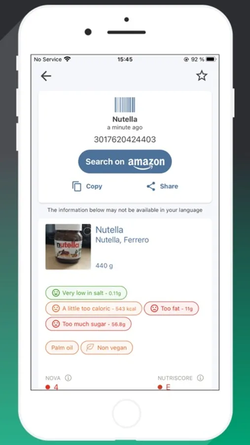 If you scan a barcode of a food product you will have access to the product sheet with all the detailed information of the product, labels to see quickly if the product is organic, halal, kosher, with or without palm oil, vegetarian or not, too fatty, too sweet and a lot of other labels that allow you to see quickly the quality of a product. The Nutriscore and the NOVA score are also included.
