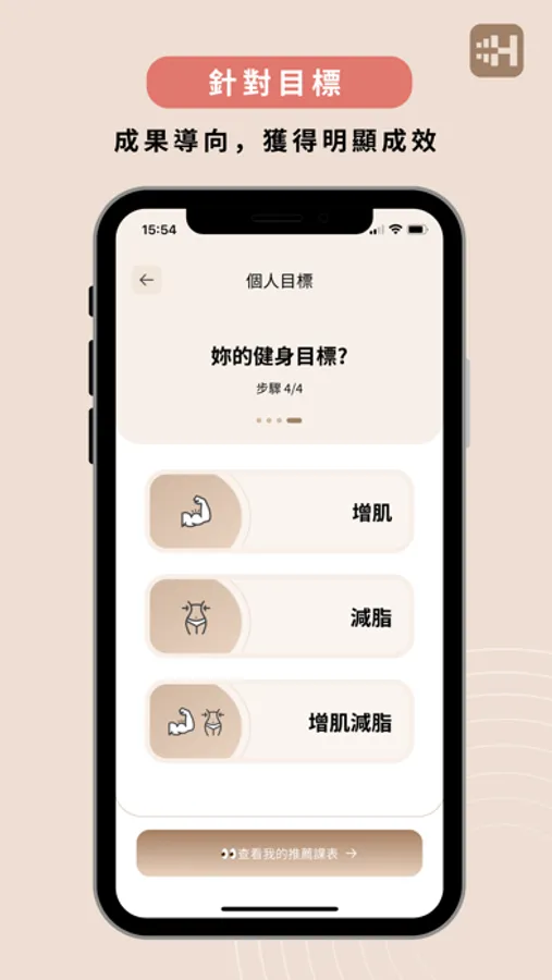 HerFIT 客製化給妳的運動計畫,依照運動經驗、地點以及個人目標推薦,可以靈活地融入你的生活,’ 幫助妳達成特定訓練成果