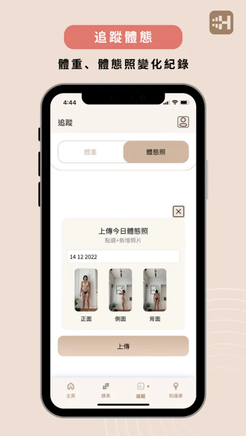 達成健身目標的依據除了體重上的進展外,持續紀錄自己的體態變化更是不可或缺的一件事 很多時候我們都會忽略了肌肉比脂肪來得重的事實,往往只專注在體重數據,卻沒有留意到自己身形上的改變,我們貼心的追蹤功能讓妳更能夠從多方面掌握自己的進度