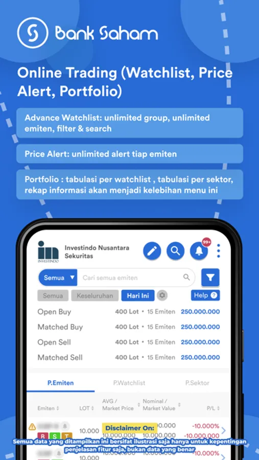 Beli/Jual Saham di Pasar Modal Indonesia. Nikmati fitur unik BankSaham antara lain : advance Watchlist, unlimited Price Alert , advance Portfolio, Order List lifetime , running trade, emiten detail, ranking, dan lain-lain.