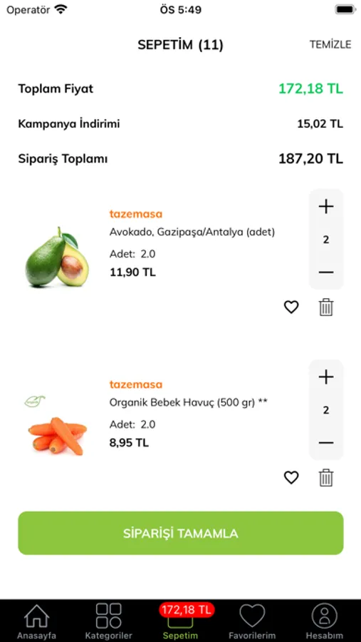 Bir tıkla sepetinize atacağınız ürünlerle kolay alışveriş mümkün. Haftanın 6 günü, saat 24:00'a kadar verdiğiniz siparişleri ertesi gün saat 22:30'a kadar, sizin seçtiğiniz gün ve saatte teslim ediyoruz.
