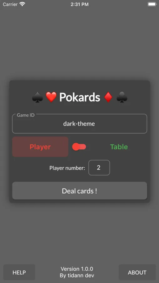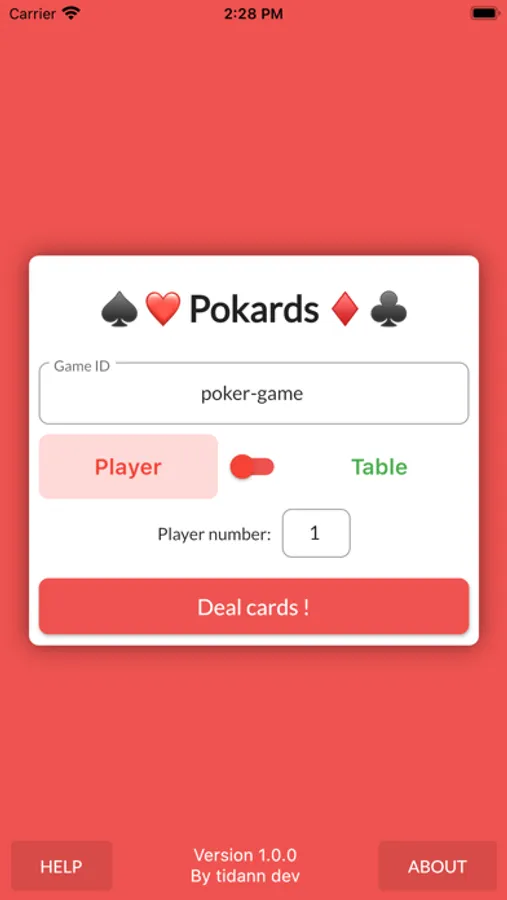 To start a game, choose a Game ID: it can be any caracter string you want (emojis allowed !), but it is important that every player use the same. Then, each player choose the Player mode and attribute themselves a number that they enter in the Player number field. You can also use another device with the Table mode selected, which you can put in the center of the table, just like with real cards.