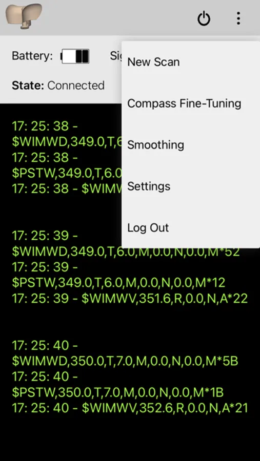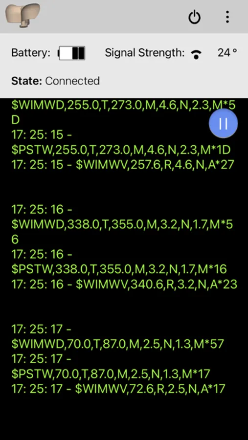 You can let this app run in the background. It hands off the wind data to other wind gauge or chartplotting apps for display (even if the screen is turned off to conserve power). It converts wind data from magnetic to true north, from Apparent to True, from wind direction to angle, and to NMEA 0183 marine electronics format. Streaming data is shown in green text as the wireless data arrives from the Wind Instrument to show you when the connection is made. There is a Pause/Play button in the upper right of the green text.