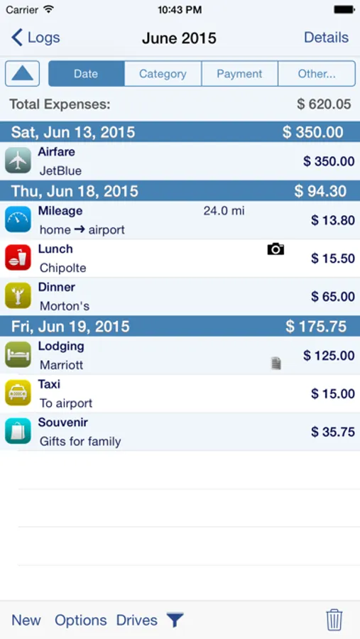 * Sort expenses by "Date" , "Category", "Payment Type" or "Client."