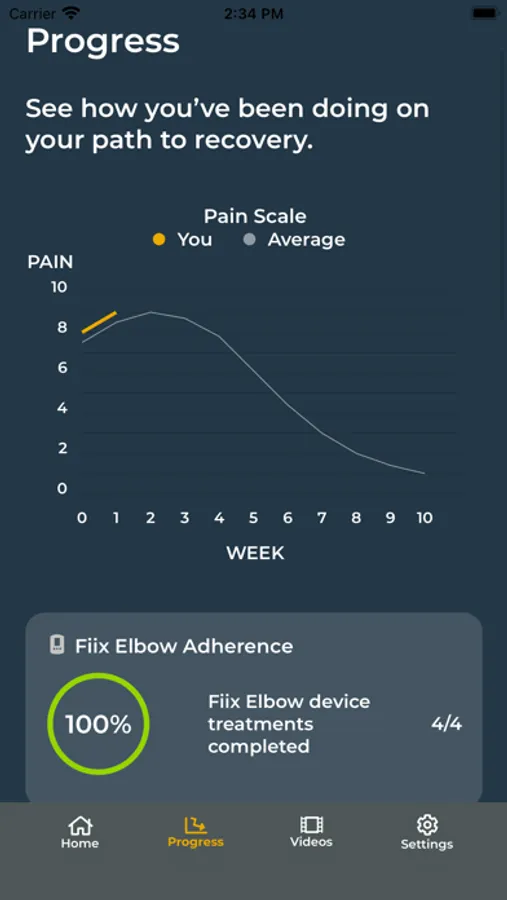 If you like data, you’ll love how the app tracks your progress so you can see how you’re doing every step of the way. You get scores each week measuring your adherence to the therapy program so you can celebrate your success. Plus, assess your pain with the weekly survey, and check out the graph that shows how you compare to others throughout the 10-week program.