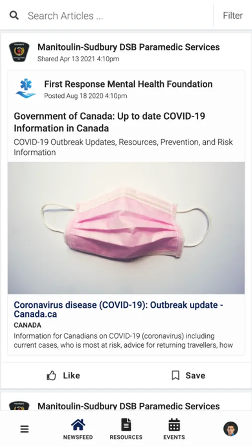 MSDSB-PS PeerConnect connects the public to information about Manitoulin-Sudbury District Services Board - Paramedic Services' programming and services. Users have access to newsfeed articles, resources, and events related to mental health, wellness, culture, and belonging.