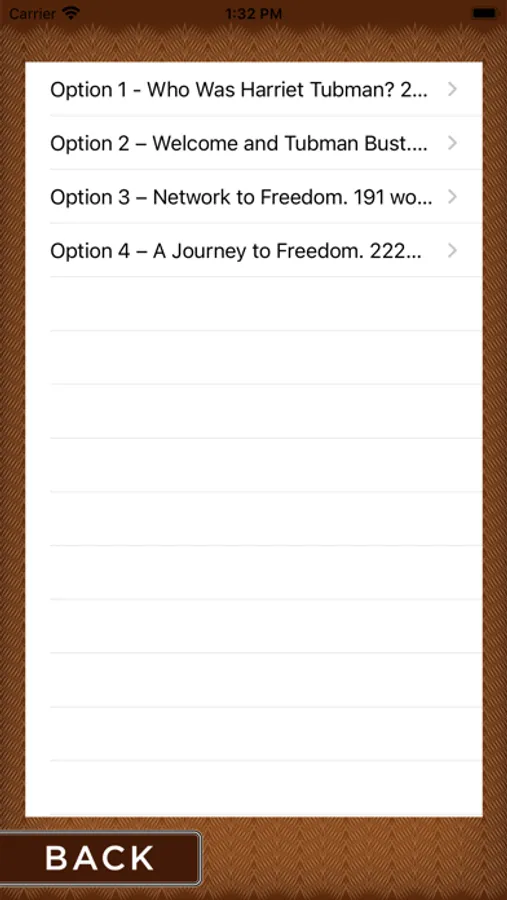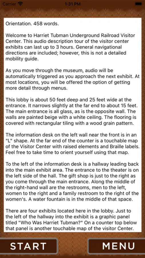 An audio description tour of the visitor center at Harriet Tubman Underground Railroad National Historical Park in Maryland. Description of the exhibits is triggered automatically by iBeacons as the visitor walks through the visitor center. Designed to be used with Apple's Voiceover capability by visitors who are blind or have low vision.