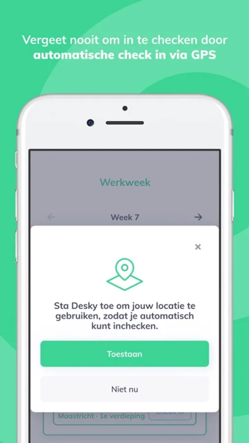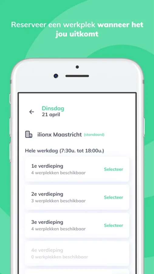 Met de Desky app reserveer je snel en makkelijk een werkplek op kantoor wanneer het jou uitkomt. Selecteer een dag waarop je een werkplek wil reserveren. Kies vervolgens een locatie, tijdslot, het aantal gasten en reserveer je werkplek. Als je op kantoor aankomt, checkt de app automatisch in via GPS.