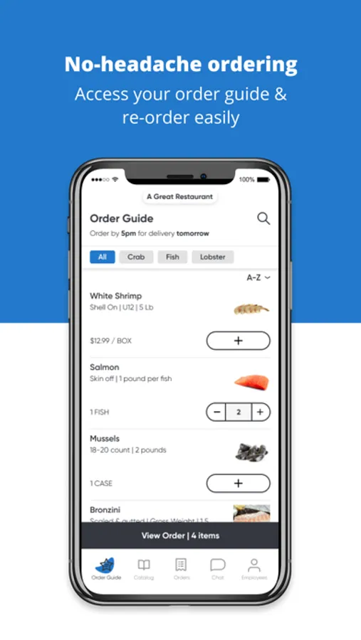 - Get in touch anytime: communicate directly with your Groomer's Seafood rep in the app
