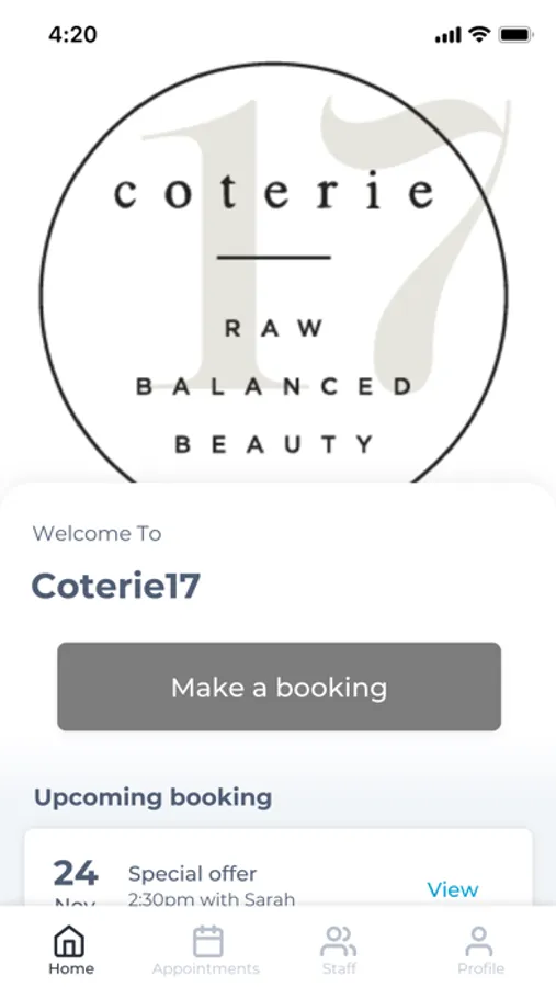 The Coterie17 app makes booking your appointments and managing your loyalty points even easier. You're just a few taps away from feeling good and looking great!