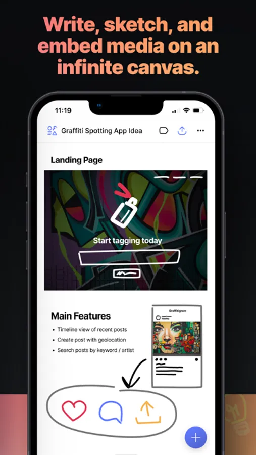 Innovative "Surface" docs enable spatial note-taking for better brainstorming, wireframing, diagramming, mind mapping, sketching and more.