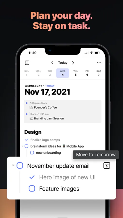 Use Daily Notes to plan your day. Any tasks you don't complete will roll-over to the next day so you never forget anything.