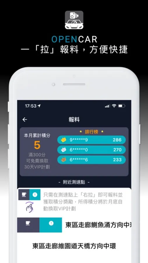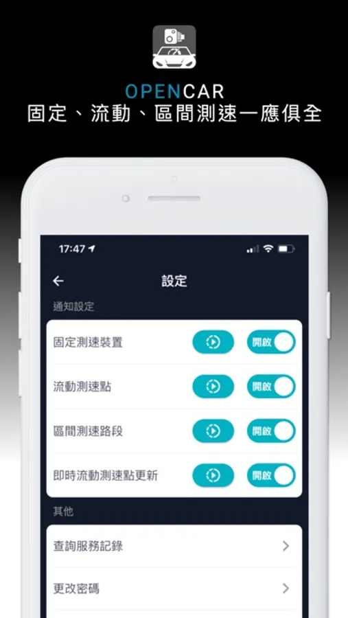 OPENCAR 收集全港流動測速、快相位置,自動提示駕駛者。能夠在待機狀態下運作,不影響播歌或導航程式使用。