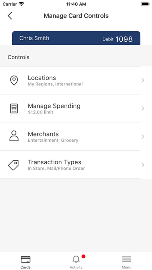 Spending limits can be established to allow transactions up to a certain dollar value and decline transactions when amounts exceed your defined thresholds. Transactions can be monitored and managed for specific merchant categories such as gas stations, department stores, restaurants entertainment, travel, and groceries. And your transactions can also be monitored for specific transaction types: in-store purchases, e-commerce transactions, mail/phone orders and ATM transactions.
