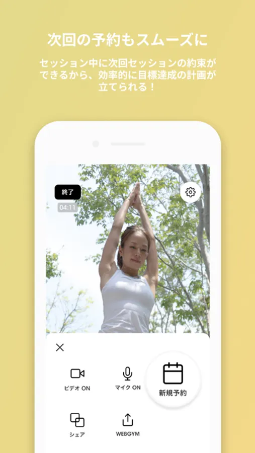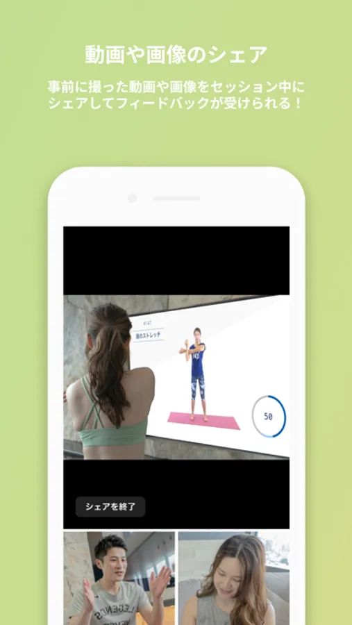 事前のメッセージで当日は安心してセッションを始めることができます。セッションに特化したビデオ通話機能だから、ストレスなくセッションに集中でき、確かな効果を感じられます。セッション中はカンタンに動画や写真のシェアができ、その場でフィードバックが受けられます。