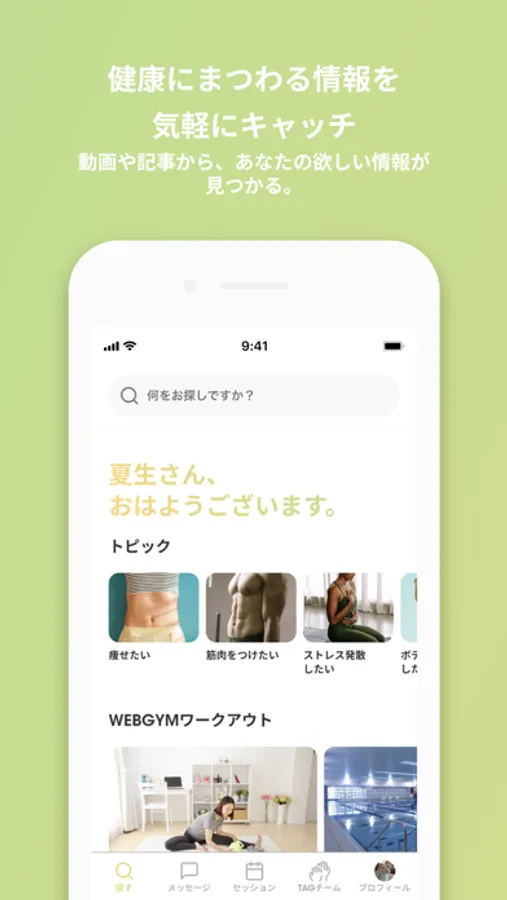アプリ内では、複数のトレーナーから成る自分専用のTAGチームを作ることができ、あなたの心と身体の健康を支えてくれます。