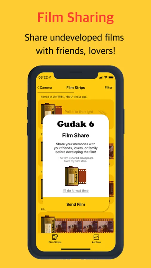 -You can share the film undeveloped with your friends. Have a special experience through film sharing!
