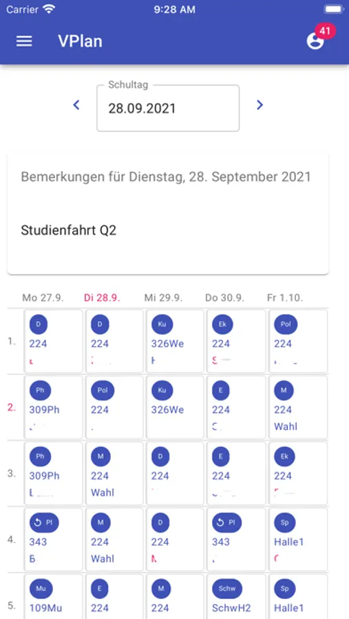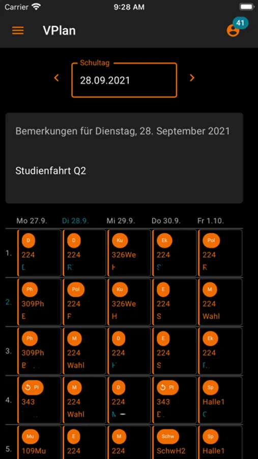 - Wochenübersicht mit allen aktuellen Änderungen (Entfall, Vertretung, Sperrung, EVA...)