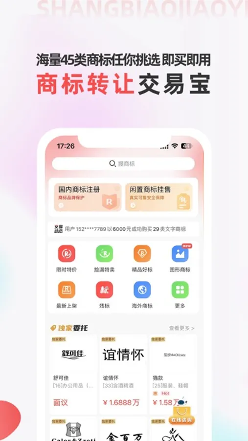 【商标转让平台】 商标注册转让,上商标转让交易宝,海量优质商标资源,品类齐全明码标价,买对不买贵,商标信息全方位展示。商标注册一站式搞定,专家预审,自助办理,省时放心。完善的交易流程,资料齐全,保障您的交易安全。