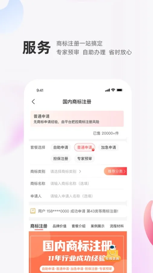 【商标注册】 在线咨询,在商标注册前查询提高注册成功率。提供商标代报低价服务、商标普通注册保姆式服务、商标注册担保服务多种套餐适合各类企业及个人用户,商标申报进度全程系统管理,实施同步国家局申请进度及状态。提供注册前商标近似查询工具、商标类别查询工具、商标申请类别选择推荐工具,商标交叉检索工具。一站式帮您解决商标申报所有疑虑和担心。