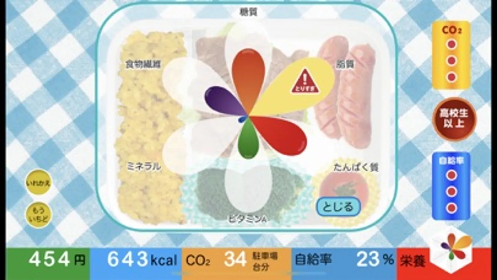 ご飯やおかずを選んで好きなお弁当を作るだけ! 1食分の栄養バランスやCO2の排出量、食料自給率に誰もがびっくり!