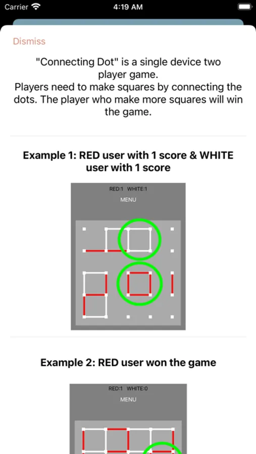 Players need to make squares by connecting the dots. The player who make more squares will win the game.