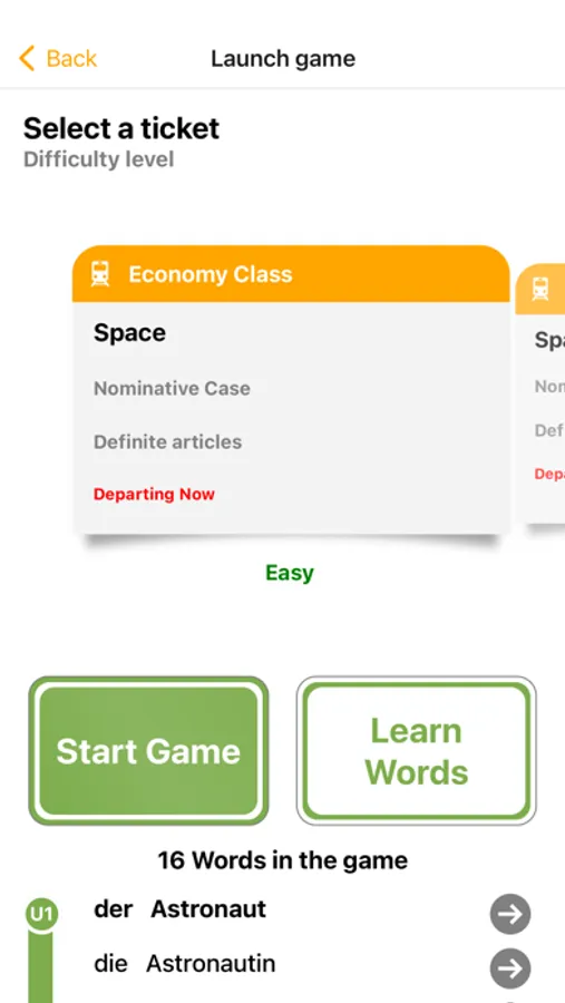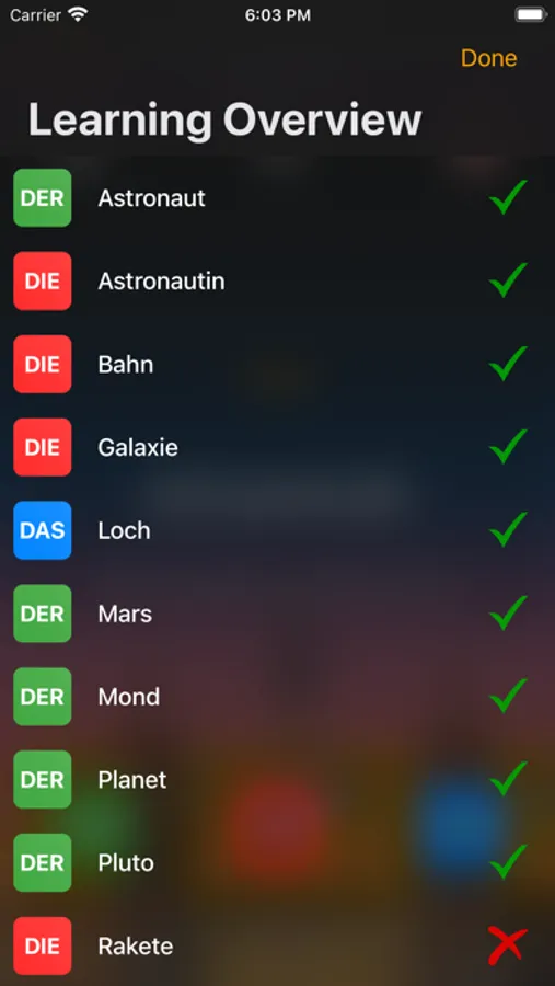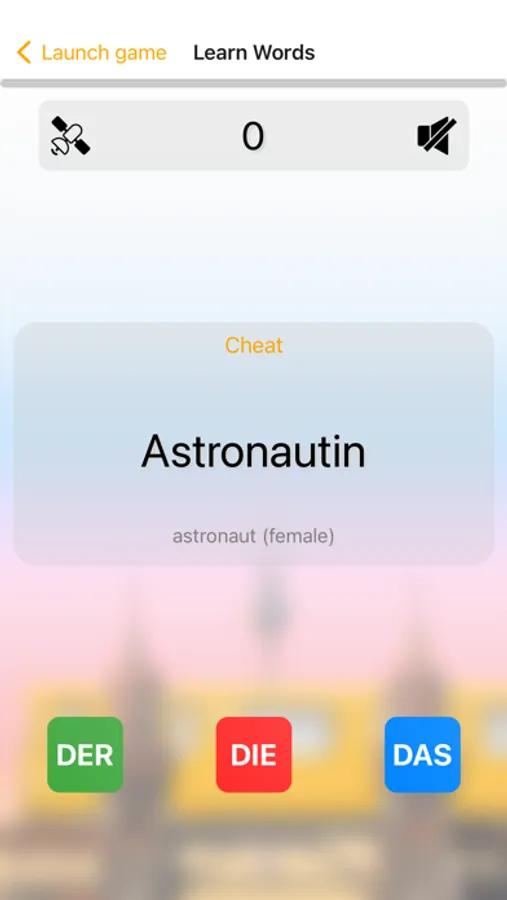 Your learning is reinforced by each word being spoken out loud and with sound effects. The words, articles, tips on remembering the articles, translations and definitions are all easily accessible from within the game menu.