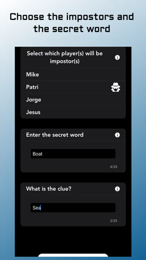* Playing with a leader: In each game, a leader will be randomly selected, who will have the important role of choosing the secret word and deciding who the impostors are.