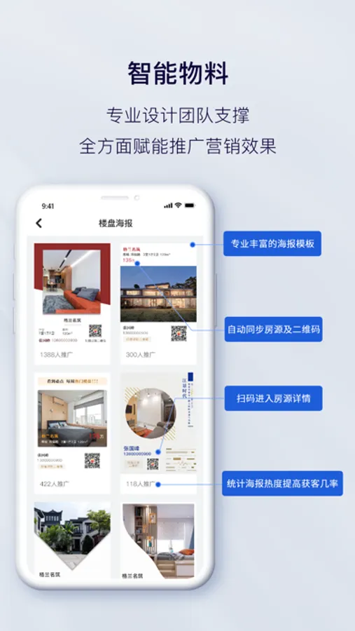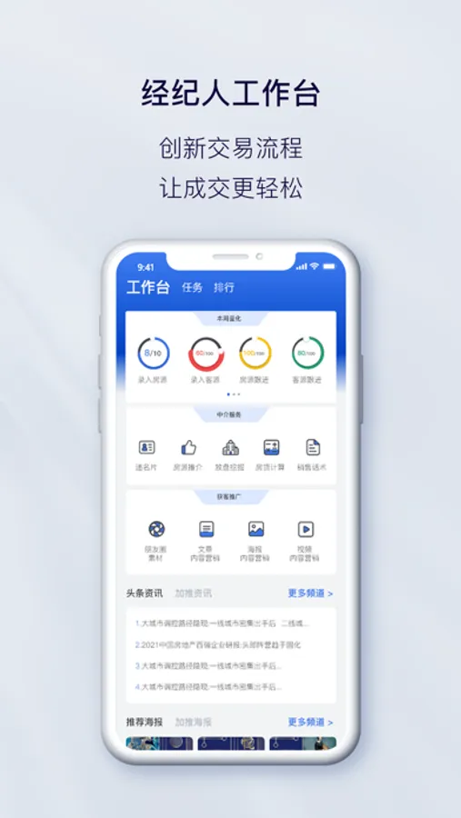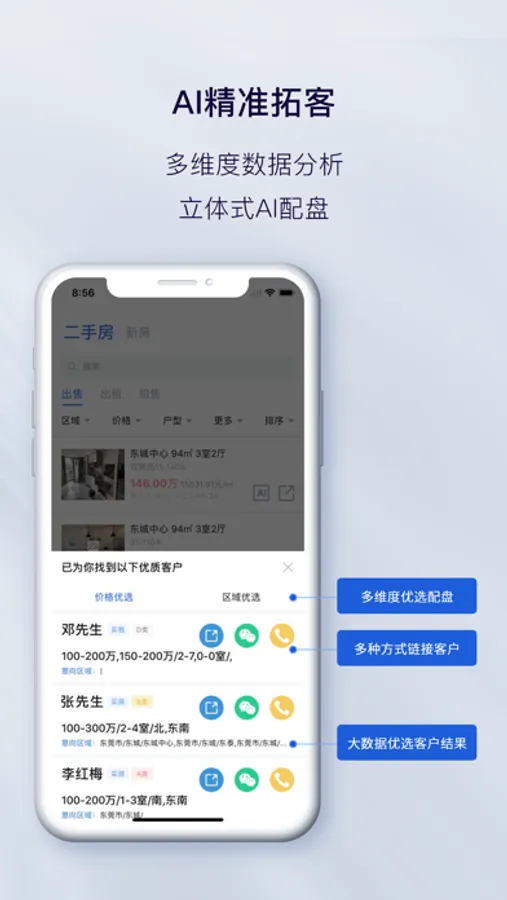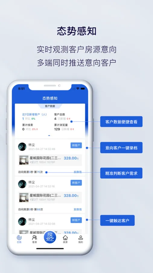 基于场景化打造的经纪人工作台,让整个客户跟进活动变得更简单和可追踪创新式的融入私域裂变营销逻辑。我们秉承“情系客户、幸福安家”的经营理念,致力创新经纪交易流程、让买房更省心,卖房更轻松。基于数据算法、人工智能技术整合,以效率提升为核心,为房产经纪人提供更高效的移动解决方案【态势感知】实时观测客户房源意向,多端同时推送意向客户。客源流量垂直管理,打造房安之私域流量池。【AI精准拓客】多维度大数据分析,智能自动为房源匹配优选客户,推荐销售跟进联系多维度数据分析,立体式AI配盘。 【智能物料】专业设计团队支撑,全方面赋能推广营销效果。销售资料都在指尖,客户行为尽在掌握。