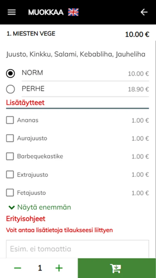 Valittuasi halutun ruoka-annoksen, lisäät sen ostoskoriin – tai valitset esim. lisätäytteitä. Voit tehdä vielä