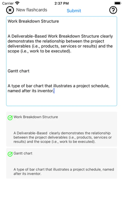 Application uses built-in camera to take picture of test question of flashcard, then it converts it to text, and finally it allows user to create collection of flashcards, notes and test questions in the cloud.
