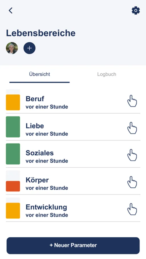 Die App hilft dir glücklicher und erfüllter zu leben. Dafür kannst du bspw. das Projekt "LEBENSBEREICHE" erstellen, und darunter dann die folgenden Parameter anlegen: