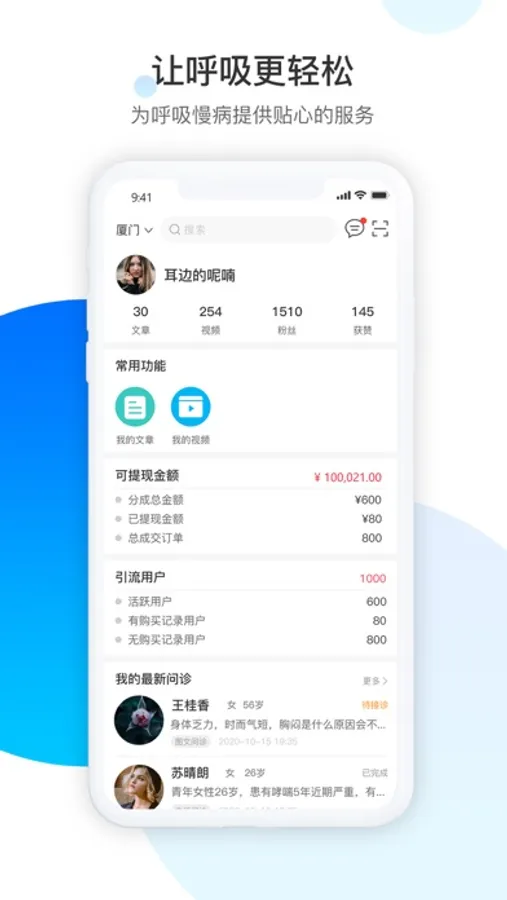 呼吸部落顾问版是一个关注呼吸健康,进行呼吸健康指导的社交化应用。应用为专业健康咨询机构提供私域社区运营工具,包含发布健康科普文章、视频教学、讲座公告、健康知识问答等,提供与患者信息交流的渠道,同时为私域运营者提供分销呼吸训练设备的功能。