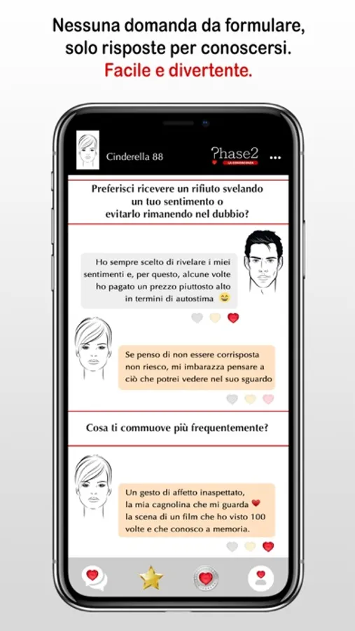 PhaseApp selezionerà le persone che corrispondono alle caratteristiche indicate, proponendo ad entrambe una serie di domande che daranno vita ad un percorso di conoscenza unico, senza lo stress di doverle formulare personalmente.