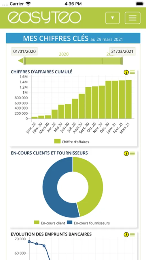 Depuis votre iPhone®, vous pourrez aisément visualiser vos tableaux de bord (suivi de trésorerie, du chiffre d’affaires, des dépenses, des budgets, etc.) ou envoyer les photos de vos notes de frais et de vos factures pour océrisation et comptabilisation.