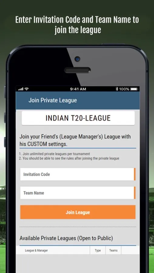 Step 2: Join public leagues or create your own private league and invite your friends.