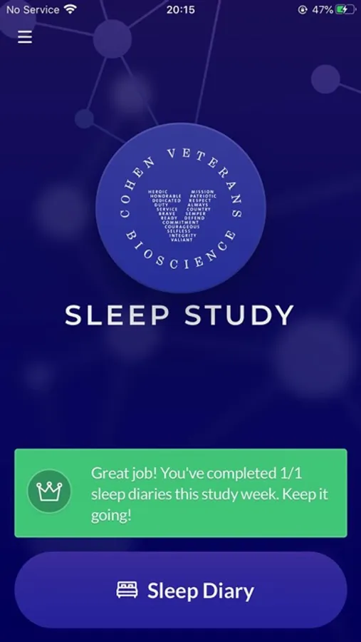 If you are participating in the Cohen Veterans Bioscience Sleep Study, this app is for you! This is the CVB Sleep Study app which will be used to collect sleep, dream, and mood data throughout the study.