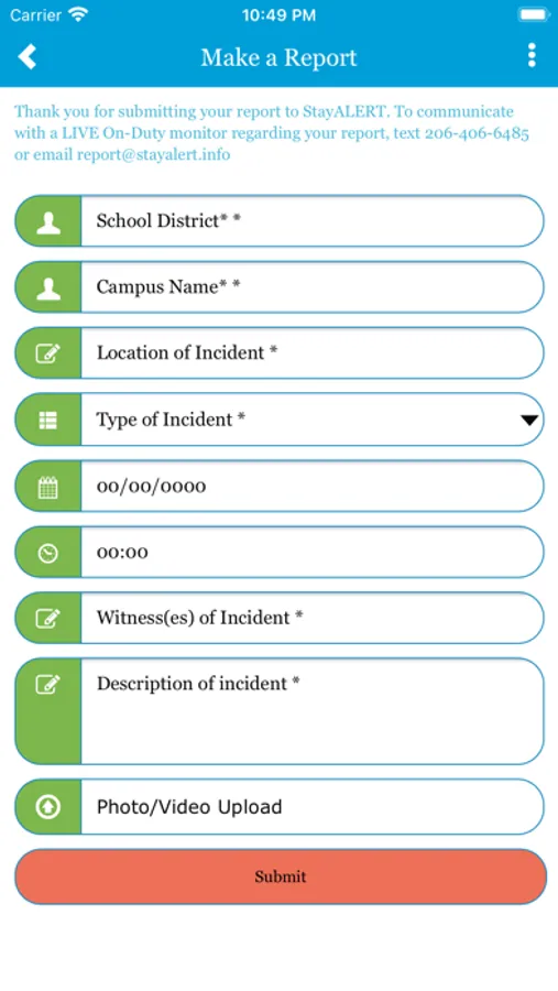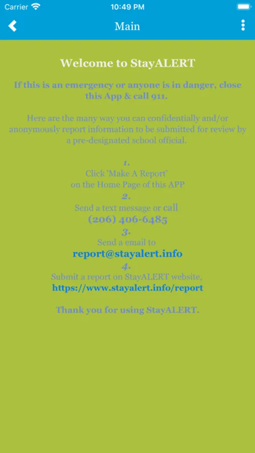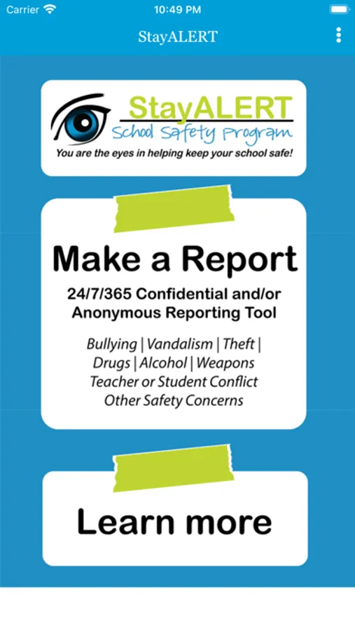 The StayALERT School Safety Program is a 24/7 bilingual reporting program designed to help provide a safer school environment. Report bullying, vandalism, drugs & alcohol, unsafe or violent behavior, harassment, weapons, teacher/student conflict, or other safety concerns.