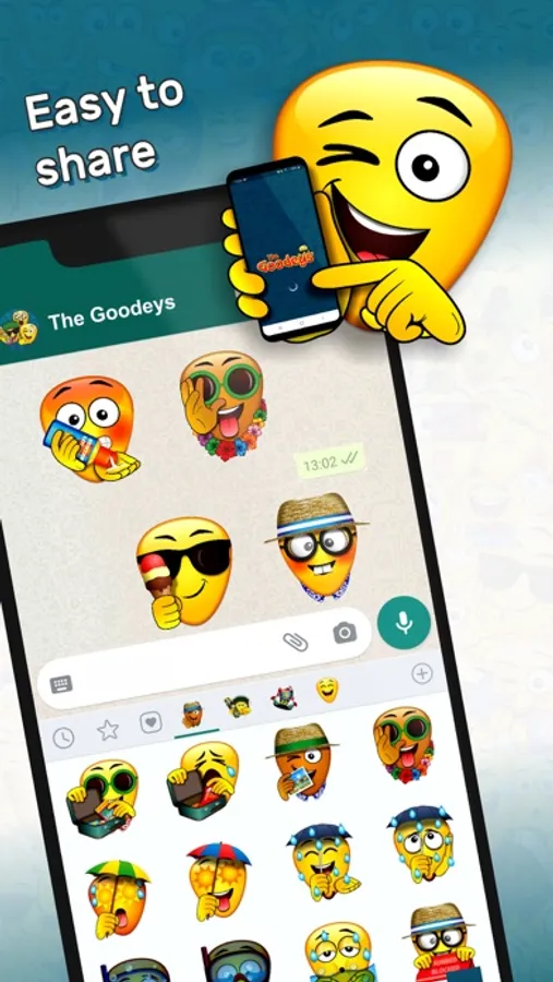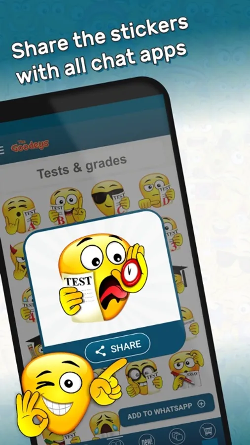 The Goodeys app offers you a large collection of stickers for WhatsApp and all other chat apps. Send stickers to all chat apps with a single touch of a button or add them to WhatsApp as sticker packs.
