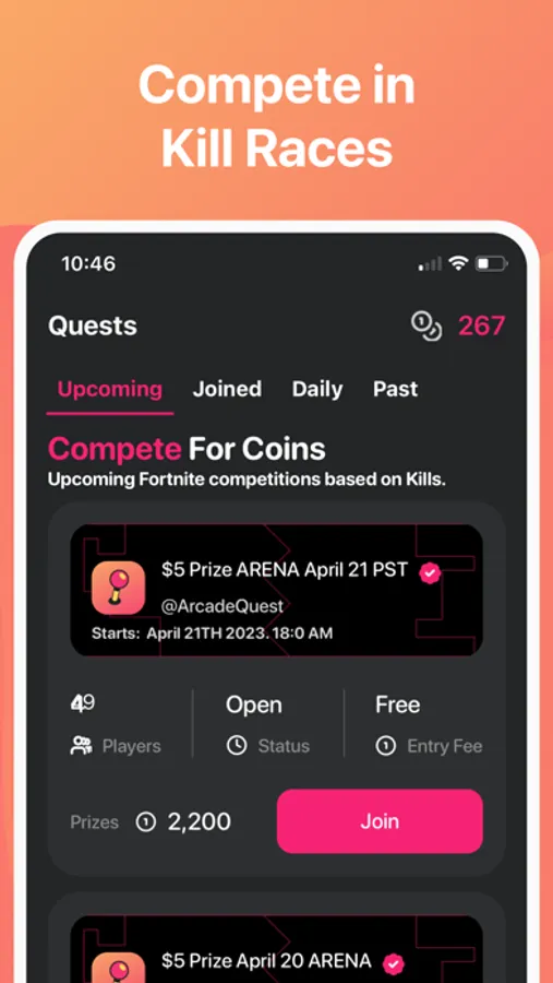 Compete against your friends and win prizes on ArcadeQuest! We built the arcade of the modern area. Win prizes for playing in Fortnite Kill Races, we call them Quests and the top 30% of players win! That's a 1:3 chance of winning a prize. We've already given out over $10,000 in prizes! Play today.